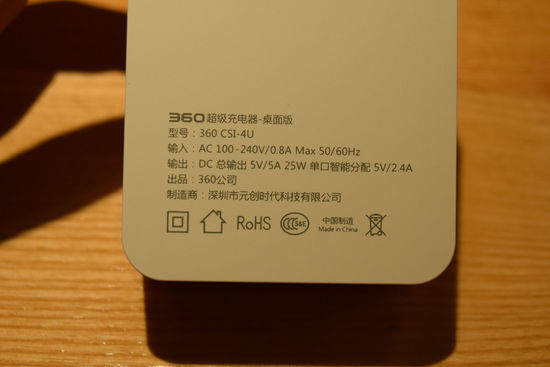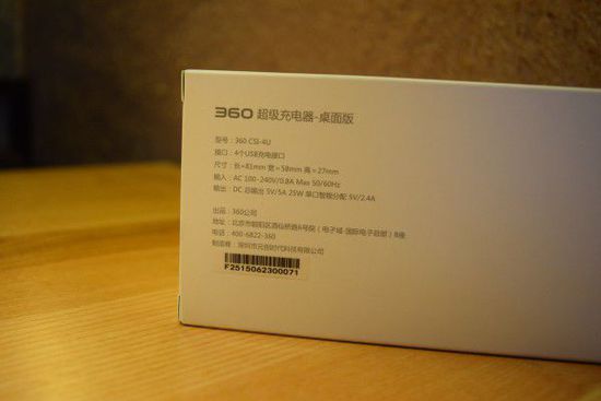 包裝的別面印有產(chǎn)品信息,360超級(jí)充電器桌面版的型號(hào)命名為360 CSI-4U,4個(gè)USB充電接口,三圍尺寸分別是長(zhǎng)寬高81x58x27mm;輸入AC100-240V,兼容全球電網(wǎng);輸出5V 5A 25W Max,單口智能分配5V 2.4A。出品方為360公司,制造商為深圳市元?jiǎng)?chuàng)時(shí)代科技有限公司。這家企業(yè)是否為360最新投資的數(shù)碼硬件公司,目前還不清楚兩者的關(guān)系。包裝盒上貼有一組序列號(hào),方便360公司追溯供應(yīng)鏈生產(chǎn)批次和日期。