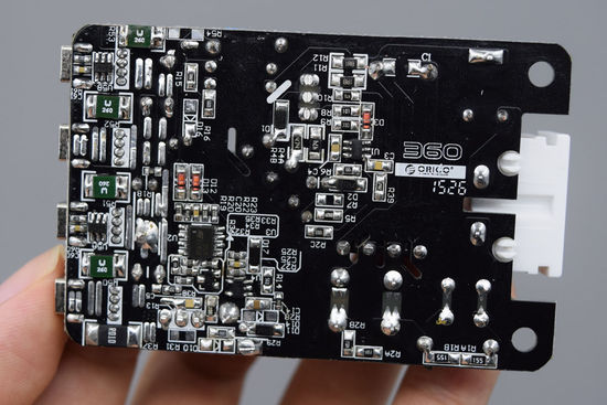 360超級(jí)充電器桌面版正面電路特寫,PCB上有360 LOGO,黑色板子。圖上為AC高壓部分,由變壓器、開關(guān)管、過流檢測(cè)、液態(tài)濾波電容、濾波電感、共模電感、X電容、Y電容、保險(xiǎn)等幾部分組成;右邊USB接口位置的DC部分,有三顆紅色1000uF/6.3V固態(tài)電容,用料比較飽滿實(shí)在。