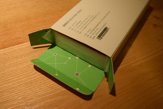 開啟后能看到透明乳白色CPE保護(hù)袋包裹著的充電器,這里比較意外的是充電器的包裝使用了450g銅版紙搭配雙面印刷工藝,里面的綠色圖案跟360公司的VI相呼應(yīng),為了保護(hù)內(nèi)部產(chǎn)品這個(gè)包裝盒用料也會(huì)比普通紙盒略貴。