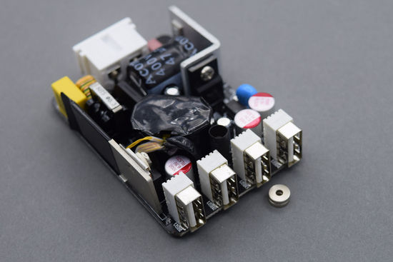 輸出部分選用了4個(gè)短體全銅USB接口,強(qiáng)力磁鐵無法吸附,刮開能看到黃色金屬材質(zhì)。銅殼比起鐵殼耐用性和電氣性能更好,成本也更高。