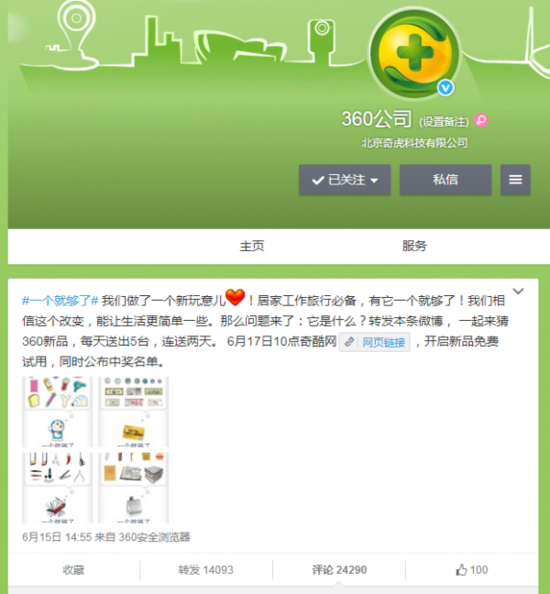 6月15日,@360公司 官方微博發(fā)布了一則曖昧的新品預(yù)告,稱做了一個(gè)居家工作旅行必備的新玩意兒,而且有它一個(gè)就夠了,相信能讓生活更簡(jiǎn)單一些。引起數(shù)萬小伙伴圍觀轉(zhuǎn)發(fā),調(diào)皮的網(wǎng)友還提供了360充電器廣告語“你的充電速度擊敗了全國99.9%的用戶?!?/p>
