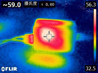 下面是溫度測(cè)試,這里使用的是美國FLIR熱成像儀,基于26攝氏度的室溫開放條件下測(cè)試。分別對(duì)5V 2A、5V 4A、5V 5A三檔負(fù)載記錄30分鐘后的溫度變化。先是5V 2A負(fù)載,這個(gè)對(duì)360充電器的輸出沒有壓力,紅外對(duì)準(zhǔn)充電器位置的外殼,讀取到的溫度為59攝氏度,考慮到室溫較高,這個(gè)溫度表現(xiàn)還不錯(cuò),不燙。