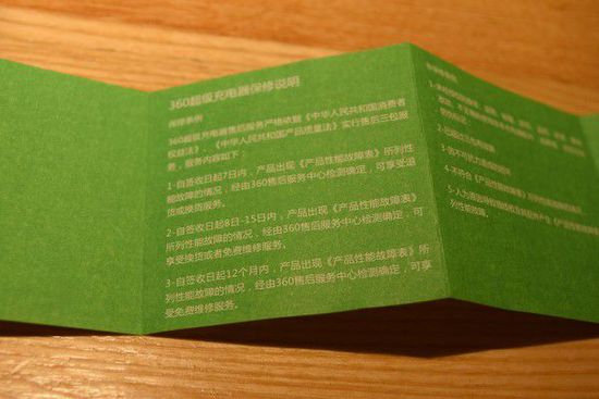 說明書背面為綠底白字的360超級(jí)充電器保修說明,這里我們找到了產(chǎn)品的三包信息,7天故障可退換,8-15天內(nèi)換貨維修,12個(gè)月內(nèi)免費(fèi)維修。作為一款采用了超聲波封裝工藝的數(shù)碼產(chǎn)品,維修是不大可能,保修期內(nèi)大多數(shù)還是給予更換。