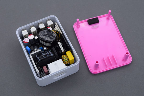 產(chǎn)品側(cè)面的AC輸入孔設(shè)計(jì)得比較有新意,跟其他充電器不一樣的是,隱藏到了外殼里面,這樣一來邊緣縫隙小,并且插拔縱深長(zhǎng),更加穩(wěn)固。