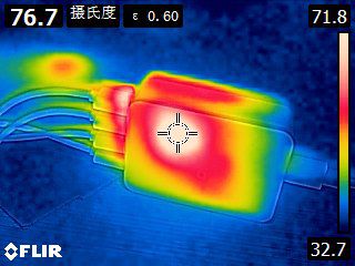 最后是5V 5A滿載負(fù)載,此時(shí)溫度升高到了76.7攝氏度,并保持在這個(gè)范圍附近,溫升沒有持續(xù)增加。用手觸摸略有發(fā)燙的感覺,尤其是充電器變壓器底部所在側(cè)面。可見日常使用中,不要阻擋充電器的散熱,保持空氣流通,這點(diǎn)很重要。