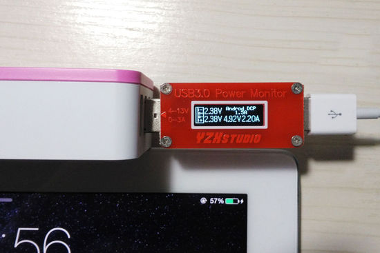 結(jié)合日常使用,我們先對(duì)iPad做充電兼容性測(cè)試。這里使用的new iPad剩余電量為57%,此時(shí)360超級(jí)充電器桌面版的輸出電壓和電流分別是4.92V 2.20A,合計(jì)10.824W,可見智能識(shí)別開啟,可匹配iPad充電。