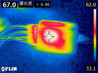 其次是5V 4A負(fù)載,360充電器溫度略有提升,達(dá)到67攝氏度,用手觸摸開始發(fā)熱,尚可接受。